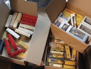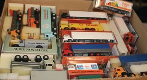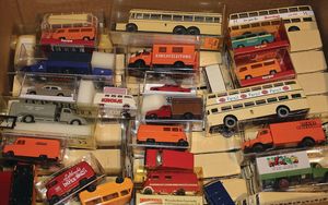 ca. 35 div. LKW´s und Busse, versch. Größen, z.B. 1:60, 1:100, 1:66 usw., zum größten Teil im Orig.-Kart., guter, neuwertiger Zust., untersch. Hersteller