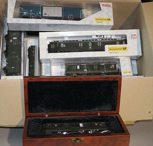 Konv. Deutsche Post, H0, Eisenbahnwagen, Philatelie, passend zu H0, Güter- und Personenwagen, electro train, Rico, Roco, Märklin, 13 Teile, neu, Orig.-verpackt, dazu 1 Exklusivmodell Dinger, in Holzschatulle