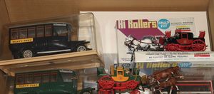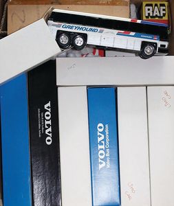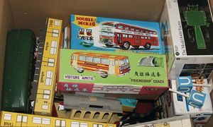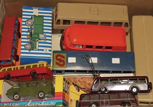 Fundkiste, untersch. Hersteller, meist Blech, Busse, größere Maßstäbe, 20 Teile, 1 Postkutsche, Blech, meist neuwertig, Orig.-Kart., bitte besichtigen