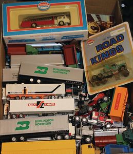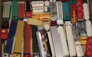Fundkiste, ca. 200 Teile, Lkw, Busse, Lkw Anhänger, teils beschädigt, teils in gutem Zust., teils aus Kunststoff, teils aus Guss, ohne Kart., versch. Hersteller
