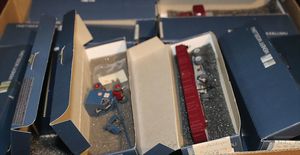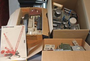 Fundkiste, H0, Modellauto-Zubehör, Kleinteile, Schilder, Zäune, Fahrzeuge, teils montiert, teilw. Kibri Bausätze, neu im Kart., bitte besichtigen