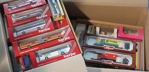 Konv. ca. 50 Teile, Busse, Lkw, H0, im Orig.-Kart., neuwertig, Herpa, Lilliput, Wiking, u. andere