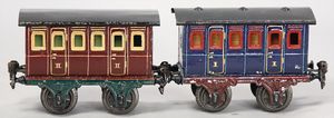 MÄRKLIN Uralt, Spur 1, Personenwagen, blau, Blech handlackiert, 1. Klasse, Personenwagen, rot/braun, 2. Klasse, 15 cm, altes Märklin-Zeichen, Wagen wurde 1 x mit Spiritus angesprüht, was dem Lack seinen alten Glanz zurückgegeben hat, Orig.-Zust., Kupplungen später