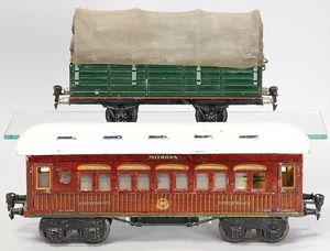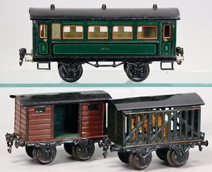 MÄRKLIN 3 Teile Spur 1, Viehtransporter, Blech handlackiert, 15,5 cm, altes Märklin-Zeichen, teilw. farbl. ausgebessert, 2-achsiger Personenwagen, Nr. 18741, Lackfehler am Dach, geschl. Güterwagen, Blech handlackiert, altes Märklin-Zeichen, 15 cm, bespielt, kl. Stellen ausgebessert