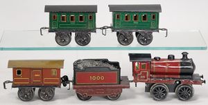 MÄRKLIN Spur 0, Schlepptenderlok B, 1980, rot/schwarz, Uhrwerk intakt, Tender Orig?, teilw. etwas ausgebessert, bitte besichtigen, dazu 3 Teile Gepäckwagen, 1882, 1. u. 2. Klasse, 8,5 cm, 1883, Gepäckwagen, braun, 8,5 cm, einfache Ösenkupplung, selten, leicht bespielt, bis auf kl. Stellen gut