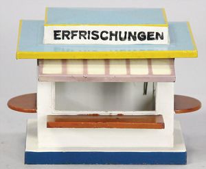 BING Erfrischungshäuschen, Blech handlackiert, Grundplatte 12,5 cm x 9,5 cm, Höhe 10,5 cm, mit aufschiebbaren Vordach, leicht bespielt, guter Zust., ca. 1929