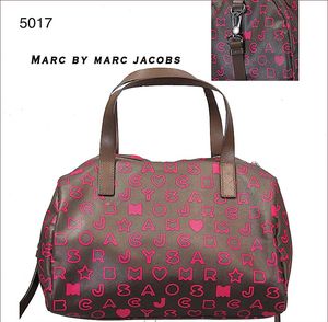 MARC BY MARC JACOBS 1x Damentasche kleiner Shopper, farbenfroher Printaufdruck, pinkfarbene Buchstaben mit Herzen, zwei lederne Trageriemen, ein langer Schultertrageriemen, Größe verstellbar, Innenfutter pinkfarbener Stoff, große Fülltasche, seitlich eine Seitentasche mit Reißverschluss, 2 Seitenfächer, für Handy und Kosmetik, 28 cm breit, 21cm hoch, silberne Messingbeschläge, guter Zustand, in original Einkaufstasche