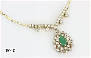 Collier, GG 585/000, 1 Smaragd-Tropfen ca. 1,50 ct von guter Farbe und mittlerer Qualität, 50 Brillanten, feines weiß/weiß - vs/si, gesamt ca. 3,50 ct, total 19,00 g, Angaben lt. Gutachten von 1982 mit Wiederbeschaffungswert über 15.500,- DM