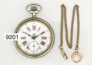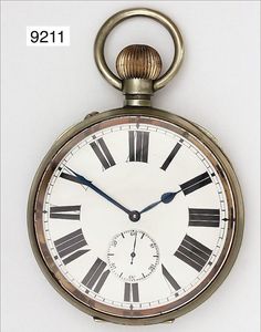 Ungewöhnlich große Metalltaschenuhr um 1900 (Eisenbahner Uhr), 8-Tage-Werk, großes Federhaus, dezentrales Minutenrad, glattes Gehäuse, sehr gut erhaltenes E.Z.Blatt mit röm. Zahlen, kl. Sek., gebläute Zeiger, ( Glas auf 7 Uhr beschädigt), D = 103,0 mm, Uhr läuft