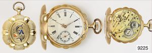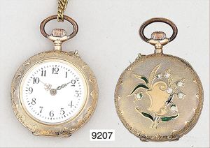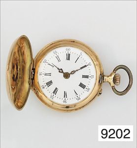 Damentaschenuhr, Half Hunter um 1910, glattes Gehäuse GG 750/000, sehr gut erhaltenes E.Z. Blatt mit röm. Zahlen und gebl. Zeigern, geschnittene Kompensations-Unruhe u. Breguetspirale, Emaille im Deckel in perfektem Zustand, D = 35,5 mm, läuft an, Reinig. bed.