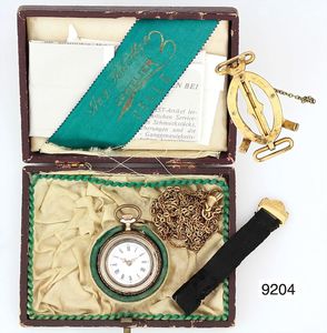 Damentaschenuhr um 1890/1900, Signiert: Q te Boutte, Nr.41053, Gold 585/000, sehr gut erhaltenes E.Z. Blatt mit röm. Zahlen, kl. Sekunde, Zylinderhemmung, 10 Steine, ungewöhnliches Ordensgehäuse mit Geheimbild im rückwertigem Deckel, Emailleeinlagen (geringfügig abgepl.), D = 36,2 mm (Gehäuse), Uhr läuft