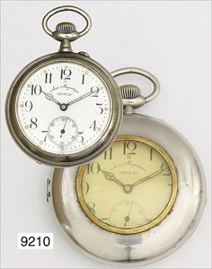 DOXA, Eisenbahneruhr um 1905 mit orig. Übergehäuse, (Kunstoffglas vergilbt), großes Doxa Brückenwerk mit Ankerhemmung, gut erhaltenes E.Z.Blatt mit arab. Zahlen (Leuchtpunkte wohl später), hinten graviert, rückwertiger Glasboden vom Zwischenboden fehlt, D = 68,0 mm, Uhr läuft