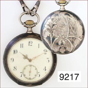 Herrentaschenuhr, JUGENDSTIL, Tulla-Silber 800/000, mit orig. Kette, Ankerhemmung, Brequetspirale, 15 Rubine, arab. Zahlen, kl. Sekunde auf 6 Uhr, Glas stark verkratzt, Tulla altersbedingt abgetragen, D = 52,5 mm, Uhr läuft