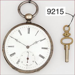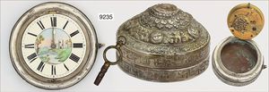 Spindeltaschenuhr, ANO TEMPLETON AYR 8783, England um 1800, ziseliertes Silbergehäuse wohl in Asien gefertigt, Emaillezifferblatt mit Landschaftszene: Burg, Fluß und Berge, röm. Zahlen, feuervergoldetes Vollplatinenwerk mit filigran gearbeiteter Spindelbrücke, Platine teilgraviert, 1 Schlüssel, D = 65 mm, H = 42 cm, Zylinder / Zapfen defekt, Uhr läuft nicht