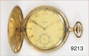 Herren Sprungdeckel Taschenuhr, Anfang 20.Jhd., Golddouble, fein gouillochiertes Gehäuse, Z.B. mit arab. Zahlen gebl. Zeiger, kl. Sekunde auf 6 Uhr, Ankerhemmung, 4 Steine, Brequet-Spirale, D = 51 mm, Uhr läuft