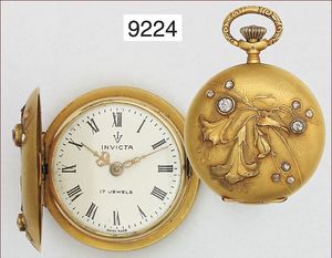 Damentaschenuhr, ausgefallenes JUGENDSTIL Gehäuse um 1910, GG 750/000, sehr schönes Gehäuse mit Lilienblüten, Altschliffdiamanten und Diamantrosen, sehr guter Zustand, Werk INVICTA nachträglich um 1930/40 eingesetzt, Brückenwerk mit Ankerhemmung, Lager in Goldchattons, D = 32,0 mm, Uhr läuft