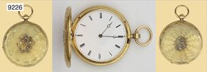Herren Sprungdeckel-Taschenuhr um 1900, reich verziertes Goldgehäuse GG 585/000, außen emailliert (dez.Fehlstelle), Zwischenboden Gold, gut erhaltenes E.Z. Blatt, röm. Zahlen, Zeiger mit 2 Diamantrosen besetzt, Ankerwerk, Breguetspirale, Chronometer reguliert, 16 Rubine, D = 52 mm, Uhr läuft