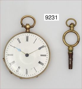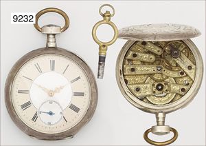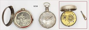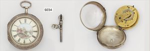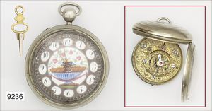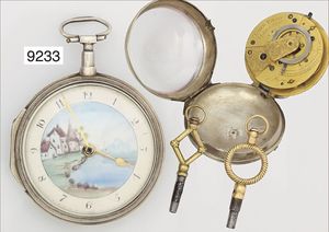 Spindeltaschenuhr, WILL LANDER LONDON 17835, England Ende um 1800. Silbergehäuse, Rückseite mit Ritter Szene, Elfenbeinzifferblatt mit Landschaftsszene: Häuser, Fluß und Berge (Zifferblatt wohl etwas später, Deckel schließt dadurch nicht korrekt), röm. Zahlen, feuervergoldetes Vollplatinenwerk mit filigran gearbeiteter Spindelbrücke, 1 Schlüssel, D = 48,5 mm, Uhr läuft