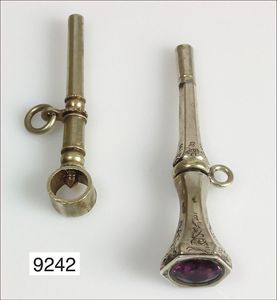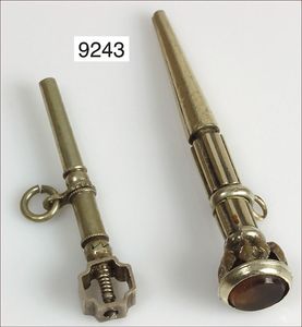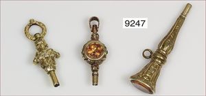 Lot: 3 Gold-Taschenuhrenschlüssel, 1 x 333/000 mit Schmuckstein L = 48 mm, 1 x 585/000 mit 2 Schmucksteinen, 1 x 750/000