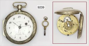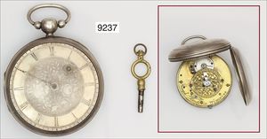 Spindeltaschenuhr mit Übergehäuse S. DRESCHER MANCHESTER 516, England Mitte / Ende 18.Jhd., Silbergehäuse, Rückseite mit Monogramm: G N, arab. Zahlen, Mondphasen Kalender, feuervergoldetes Vollplatinenwerk mit filigran gearbeiteter Spindelbrücke, Übergehäuse (leicht verzogen), mit altem Papierbild ausgelegt, Glas später (nicht orig.), Std. Zeiger fehlt, 1 Schlüssel, D = 48 mm, (ohne Übergehäuse), Uhr läuft an