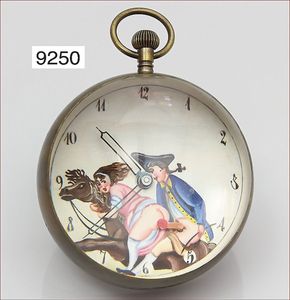 Kugel-Uhr, 70/80er Jahre, EROTISCHES MOTIV mit Komplikation !, arab. Zahlen, beidseitig mit Glas, Handaufzug, D = 65 mm, Uhr läuft