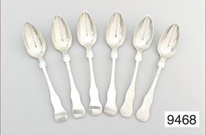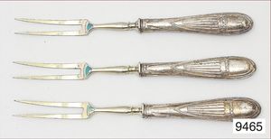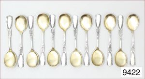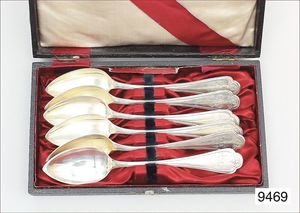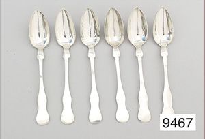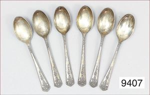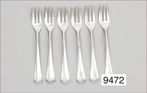 Eßbesteck für 6 Personen, Wien um 1900, Silber mind. 800/000, Eßbesteck je 6 große Gabel, Messer u. Löffel, L = 21,5 - 26 cm; Dessertbesteck: Gabel u. Messer, L = 19 - 21 cm; Kaffelöffel, L = 15 cm, Moccalöffel, L = 11,3 cm !; 1 Soßenkelle, L = 23 cm, 1 Suppenkelle, L = 31,5 cm, je 1 kl. u. gr. Fleischgabel, L = 21 u. 26 cm 1 gr. Vorlegelöffel, 26,7 cm, 1 Tortenschaufel, L = 27 cm, ttotal 2,67 kg