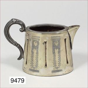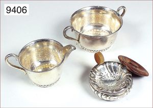 Lot: Metall versilbert, DÄNEMARK, 1 x Milchkännchen, H = 69 mm, 1 x Zuckerschale, H = 69 mm, 1 x Teesieb mit Auffangschale und Holzdeckel, D = 79 mm