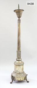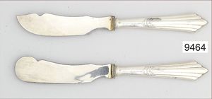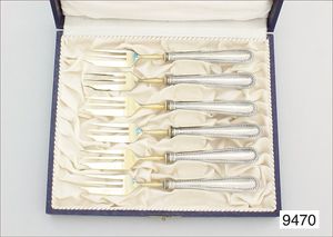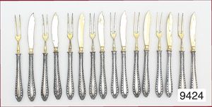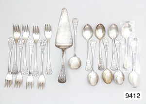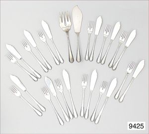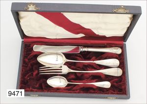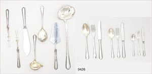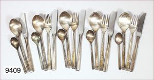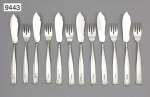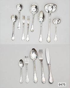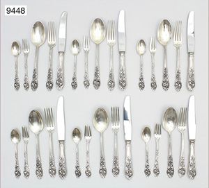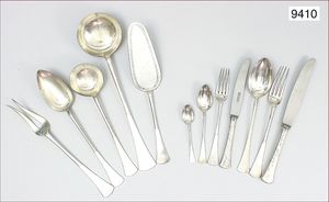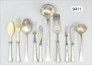 Eßbesteck für 6 Personen, Prag um 1900, Silber mind. 800/000, Eßbesteck je 6 große Gabeln, Messer, u. Löffel, L = 21,5 - 25 cm; Dessertbesteck je 6 Gabel, u. Messer, L = 18,3 - 20,5 cm; 6 Kaffelöffel, L = 15 cm, 1 Soßenkelle, L = 20,7 cm, 1 Suppenkelle, L = 31,5 cm, je 1 kl. u. gr. Fleischgabel, L = 20,5 - 22,7 cm, 1 gr. Vorlegelöffel, L = 24,4 cm, 1 Tortenschaufel, L = 27,5 cm, je 1 Butter u. Käsemesser, L = 20 - 20,4 cm, 1 Salatbesteck, Gabel u. Löffel mit Bein (1 Beinteil muß neu gekittet werden), L = 23,2 u. 25,3 cm, total 3,12 kg