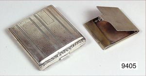 Lot aus den 20/30 Jahren: Zigarettenetui, ART-DECO, Metall versilbert, 76 x 85 x 15,5 mm; Streichholzetui, Metall versilbert mit feiner Ziselierung, 52 x 58,5 x 6,5 mm