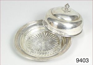 Buttergefäß, BIRKS amerik. Hersteller, Silber 925/000, Glaseinsatz, Teller am Rand durchbrochen, D = 16 cm, H = 8,3 cm