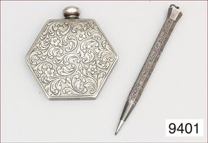 Lot: Parfum-Flacon 30er Jahre, Silber 830/000, feine Gravur, D = 60 mm, Bleistift, Silber 925/000, ca. L. 9,5 cm