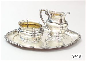Lot: Tablett, Milchkännchen, Zuckerschale, LUTZ u. WEIß Pforzheim, 1930/40 Jahre, Silber 835/000, Kännchen u. Schale Innen vergoldet, Tablett 25,8 x 16,5 cm, Kännchen H = 9,3 cm, Schale H = 5,1cm, total 337 g