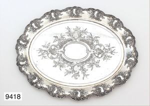 Tablett, deutsch Ende 19.Jhd., Silber 800/000, oval, Innenfläche aufwendig graviert, außen gedrücktes Muster, 25 x 31 cm, total 351 g