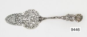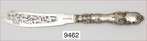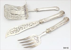 Fischbesteck ! Dekoratives Messer, Gabel und ein Heber, Silber, PUIFORCAT S.A. Frankreich um 1920, eine der bedeutensten Silberschmiede Frankreichs, sie fertigen für Königshäuser und Luxus-Hotels, oder andere….! alle vorderen Teile sind mit durchbrochenem Ornament versehen und floral nachgraviert, Griffe an den Enden mit Akanthusblättern versehen, die einen weichen Abschluß bilden, Länge der Besteckteile, von 26,5 bis 30,0 cm