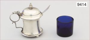 Kleines Gewürzgefäß, BIRMINGHAM 1905/10, Silber 925/000, mit Deckel, blauem Glaseinsatz und Löffelchen Silber 800/000 (Löffel nicht Original)