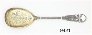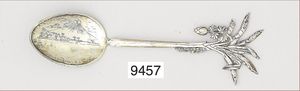 Löffel, JAPAN " um 1920, Silber (geprüft), Bananenblätter und Staude, Gravur in der Laffel: "Fujiyama"(als Bild), u. "MAJON VOL.P.I.", L = 141,5 mm, sehr schöne Qualität