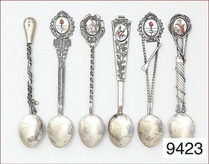 6 kleine Löffelchen, Silber 900/000, Mittelamerika, Emailleplaketten handcolloriert, L = 10,8-11,5 mm