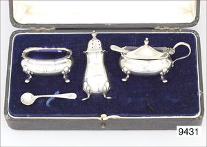 Gewürzsalieren mit Streuer, BIRMINGHAM 1925/26, Sterlingsilber 925/000, dezentes Monogramm (G), 1 Streuer u. 2 Salieren (mit blauem Glaseinsatz), 2 Löffelchen, mit Samt und Stoff ausgeschlagene orig. Schatulle (mit Papier bezogen)