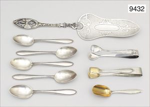 Lot: 5 Teelöffel, WMF, 90er Auflage, 1 Tortenschaufel, 2 Zuckerzangen, 1 kleines Schäufelchen, Metall (teilvergoldet)