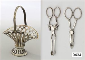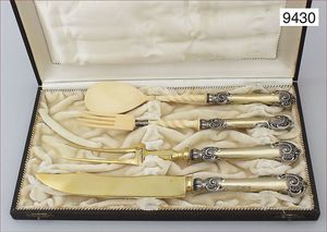 Besteckset: Ende 19.Jhd., in orig. Schatulle, Salatbesteck: Silber 800/000, Vorderteile aus Bein, L. ca. 25,5 cm (Gabel vorne alt Rep.), Tranchierbesteck: Silber 800/000 Gabel & Messer, Klingen vergoldet, L. ca. 30,0 cm, alle verzierten Griffe teilvergoldet