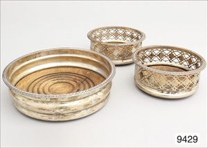 Flaschenuntersetzer wohl England 20er Jahre, Kupfer versilbert, Buchenholz, 2 x klein, D = 10,0 cm, 1 x groß D = 14,0 cm