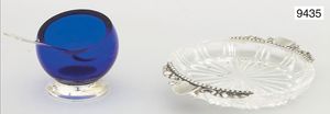 Lot: 1 kl. Aschenbecher, Silber 835/000, Glas, 6,8 cm Durchmesser, 1 kl. Salzgefäß, Silber 925/000, blaues Glas, kl. Löffel Silber 925/000