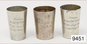 Lot: 3 Kleine Becher, 2 x sig. W.BISTRICK, Ag 800/000 mit Gravur: Preuss. Regatta-Verein 25/26. Juni 1927 Königsberg Pr.; 1 x Ag 800/000 Gravur: Königsberg Pr. 13.7.30