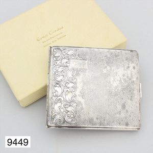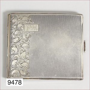 Zigarettenetui WMF, aus den 50er Jahren, Neusilber, innen vergold., auf beiden Seiten aufwendig graviert, Monogramm außen: P.M, innen: eine Erinnerungs - Gravur, 92 x 81 x 17 mm, Originalschachtel