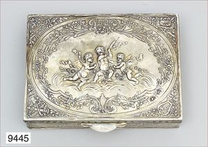 Dose um 1900/20, HANAUER Arbeit, Ag 800/000, innen vergoldet, 3 Putten von Rosen umrankt, 15,5 x 11 x 4,3 cm, ca. 480 g
