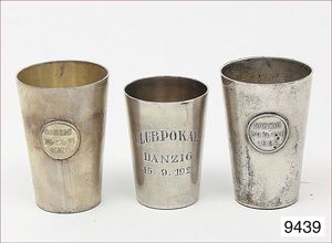 Lot: 3 Kleine Becher, alte Reichsstadt DANZIG, Fa. M.Stumpf & Sohn, 2 x Ag 800/000, H = 50 mm, Gravur: DANZIG 26-27.6.1926 u. DANZIG 30.6-1.7.1928, 1 x Ag 835/000, H = 42,5 mm, Gravur: CLUBPOKAL DANZIG 15.9.1929