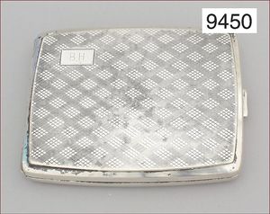Zigarettenetui 50er Jahre, Alpacca, gemarkt S Alpacca, beidseitige, vorne Gravur mit Monogramm B.H., innen goldfarben, ca. 100,0 X 79,5 x 15,0 mm