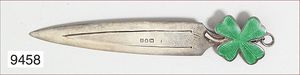 Ungewöhnlicher Brieföffner, ENGLAND (London hallmarks), Silber, hinten mit integriertem Bleistift (Original), emailliertes Kleeblatt, auch als Buchzeichen zu verwenden, L = 104,5 mm