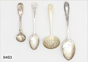 Lot: 4 Teile, 1 Kaffelöffel, Birmingham 1919/20, Silber; 1 x Kaffeelöffel, London Anf. 20.Jhd., Silber; 1 kl.Löffel u.1 Heber, plated, L = 92-139 mm