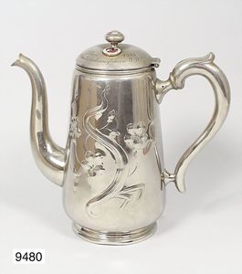Teekanne, JUGENDSTIL 1905 BMF &Co, Metall versilbert, Plakette: RADFAHRER-VEREIN SPORT 3. Preis 1905. 100 km Silberkranzfahren 3:57:20, schöne Jugendstil Blumendekor, H = 21 cm